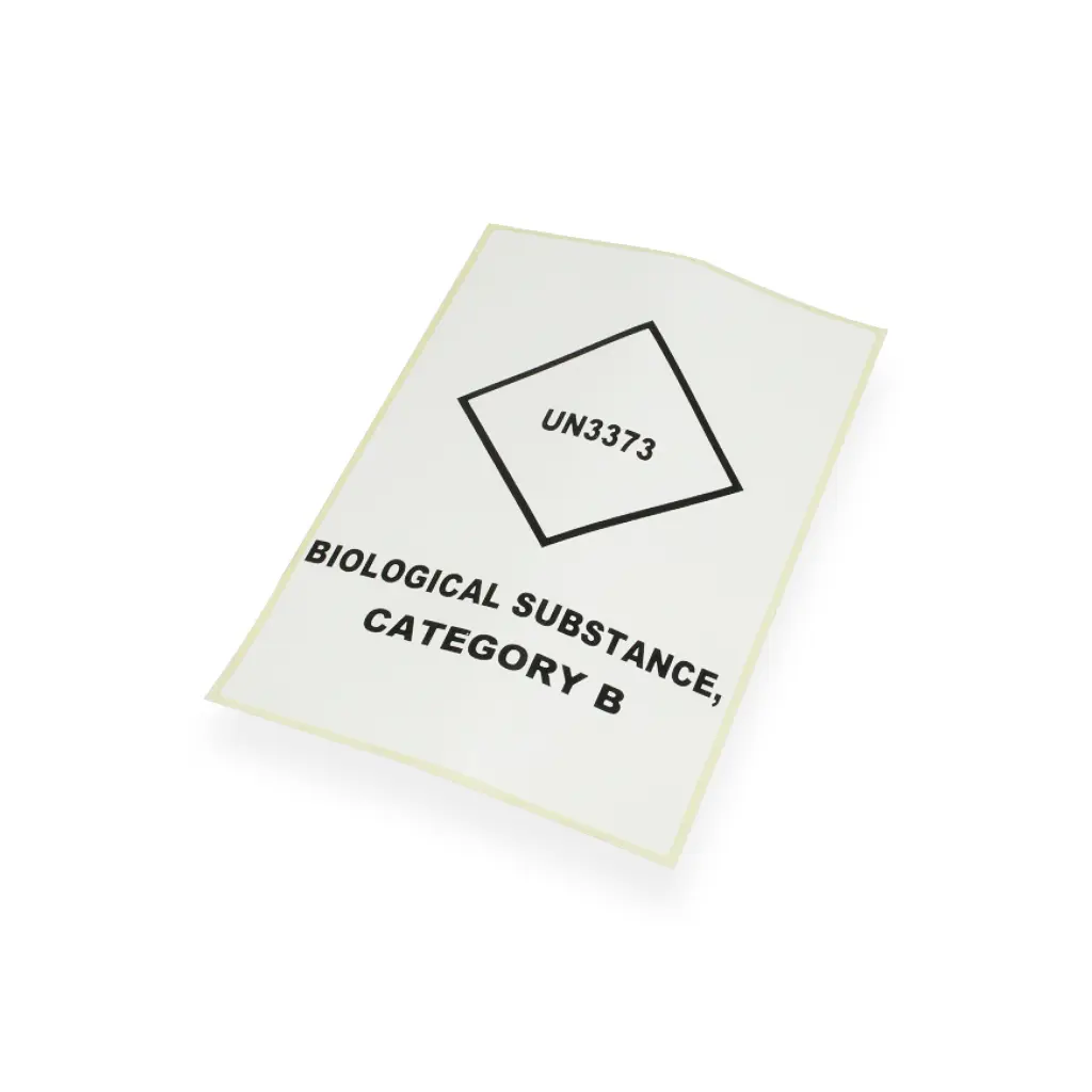 Deze labels / stickers voldoen aan de verpakkingsvoorschriften, zoals deze gelden voor buitenverpakkingen volgens verpakkingsinstructie P()I)650 (biologische stoffen UN3373) Tevens zijn er speciale labels voor transport met droogijs.