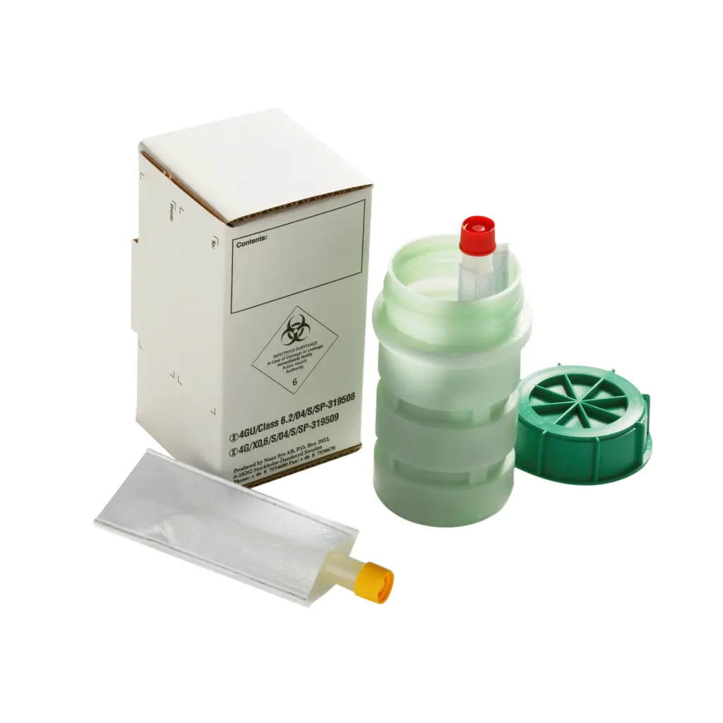 Verpakking geschikt voor klasse 6.2 infectieuze stoffen. Dit zijn besmettelijke stoffen zoals Disease X, Apenpokken, Vogelgriep, Ebola, Marburg, Hanta, Hendra, Lassa, Corona virussen (zoals SARS, MERS en Covid-19) en soortgelijke. De verpakking voldoet volledig aan de verpakkingsinstructie P(I)620. Voor alle zekerheid kan de groene, vloeistofdichte, container extra verpakt worden in een los te bestellen Safetybag 460907. Complete verpakking bestaat uit: 520001 (groene DG container 500ml) 520002 - 1 paar (schokabsorberende tussenschot) 520003 - 4 stuks (absorberende zakje 20ml) 520004 (kartonnen doos)