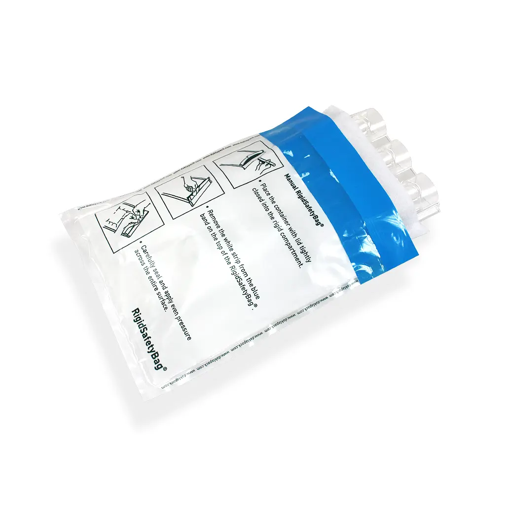 De Rigid Safetybag 3 posities is een unieke en efficiënte nieuwe oplossing voor het versturen van biologische stoffen. De Rigid Safetybag voldoet aan de eisen van PostNL en is goedgekeurd door het Belgisch Verpakkings Instituut. De Rigid Safetybag bestaat uit een vloeistof- en stofdichte zak met daarin een blister met 3 posities, omgeven door een absorberende pouch. Deze kan de volledige inhoud van 3 buizen van 10 ml kan absorberen in geval van een calamiteit. De Safetybag is voorzien van Engelse tekst.