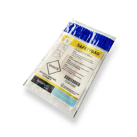 "Deze Safetybags bestaan voor ongeveer 80% uit gerecycled PE. Het hergebruiken (recyclen) van PE biedt twee belangrijke voordelen: het vermindert de behoefte aan aardolie voor de productie van Safetybags en het verlaagt de uitstoot van broeikasgassen. Hergebruik vereist minder energie dan het produceren van nieuwe Safetybags. De eigenschappen van de Safetybag zijn ongewijzigd gebleven. De Safetybag is voorzien van een absoluut vloeistofdichte zekerheidssluiting. De verpakking is gemaakt van sterk, transparant gerecycled polyethyleen en houdt gegarandeerd vloeistoffen binnen en buiten. Met de eenvoudig te verwijderen afdekstrip wordt de zak hermetisch afgesloten. De Safetybag is zeer geschikt als secundaire, vloeistofdichte verpakking voor bijvoorbeeld biologische stoffen uit categorie B. De Safetybag is aan beide zijden bedrukt. In combinatie met de Transportblister, de PolyMed verzendenvelop en voldoende absorberend materiaal voldoet deze samenstelling aan de verpakkingsvoorschriften P650, P904 en PI959. Voor afwijkende formaten en bedrukkingen kunt u een offerte aanvragen."