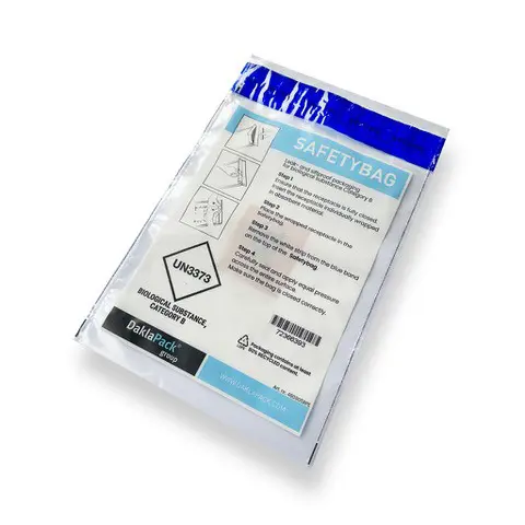 "Deze Safetybags bestaan voor ongeveer 80% uit gerecycled PE. Het hergebruiken (recyclen) van PE biedt twee belangrijke voordelen: het vermindert de behoefte aan aardolie voor de productie van Safetybags en het verlaagt de uitstoot van broeikasgassen. Hergebruik vereist minder energie dan het produceren van nieuwe Safetybags. De eigenschappen van de Safetybag zijn ongewijzigd gebleven. De Safetybag is voorzien van een absoluut vloeistofdichte zekerheidssluiting. De verpakking is gemaakt van sterk, transparant gerecycled polyethyleen en houdt gegarandeerd vloeistoffen binnen en buiten. Met de eenvoudig te verwijderen afdekstrip wordt de zak hermetisch afgesloten. De Safetybag is zeer geschikt als secundaire, vloeistofdichte verpakking voor bijvoorbeeld biologische stoffen uit categorie B. De Safetybag is aan beide zijden bedrukt. In combinatie met de Transportblister, de PolyMed verzendenvelop en voldoende absorberend materiaal voldoet deze samenstelling aan de verpakkingsvoorschriften P650, P904 en PI959. Voor afwijkende formaten en bedrukkingen kunt u een offerte aanvragen."